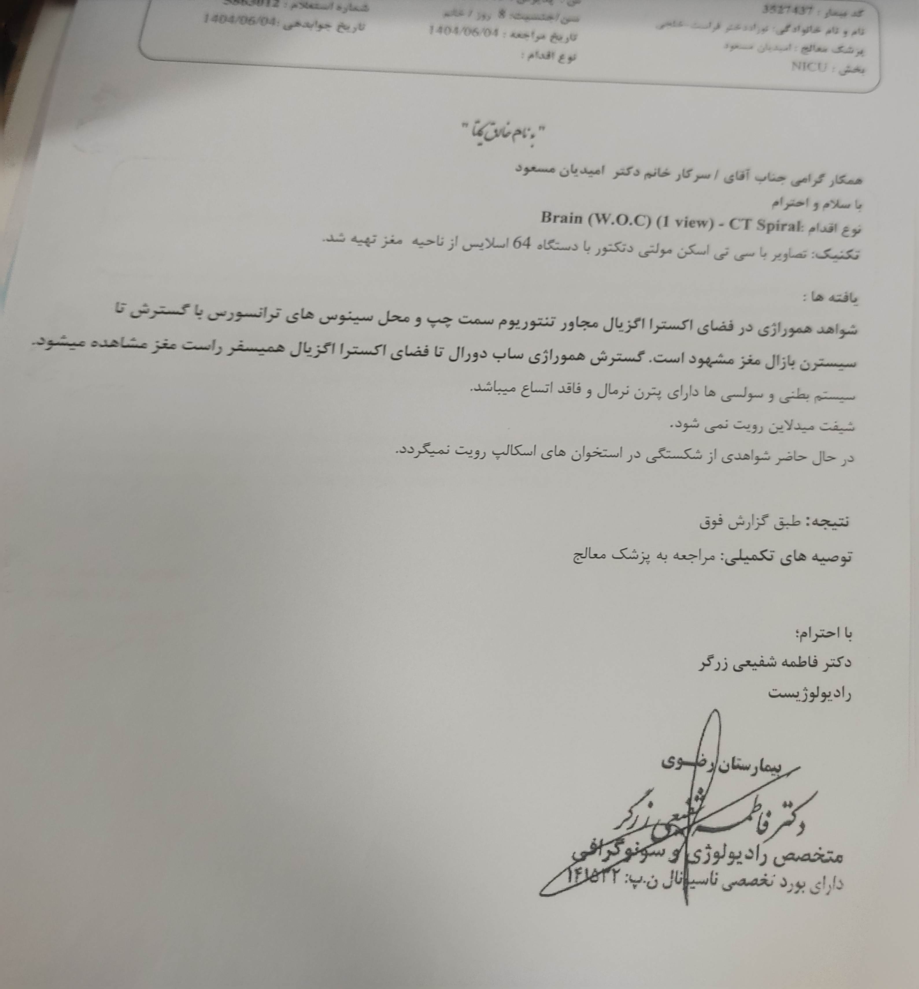 نوزاد در nicu یک نوبت تشنج میکند که تحت درمان با فنوباربیتال قرار گرفته است و سی تی مغز شده است که شواهد هموراژی مشاهده میشود