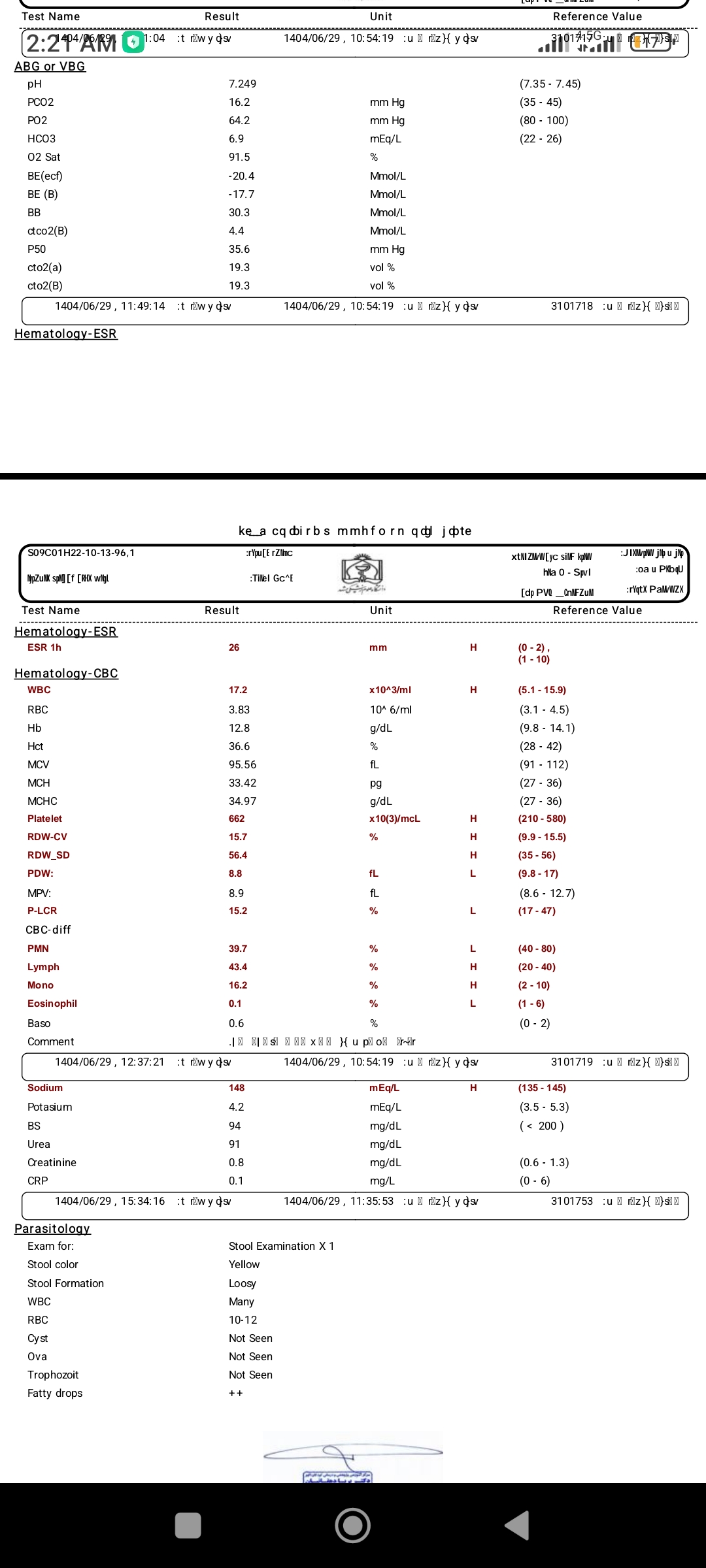 بیمار از دیروز تب ۳۸/۲ زیر بغل داشته و دیروز ۷ نوبت اجابت مزاج داشته که معمولا ۳ نوبت در روز بوده است . مدفوع خونی نبوده است