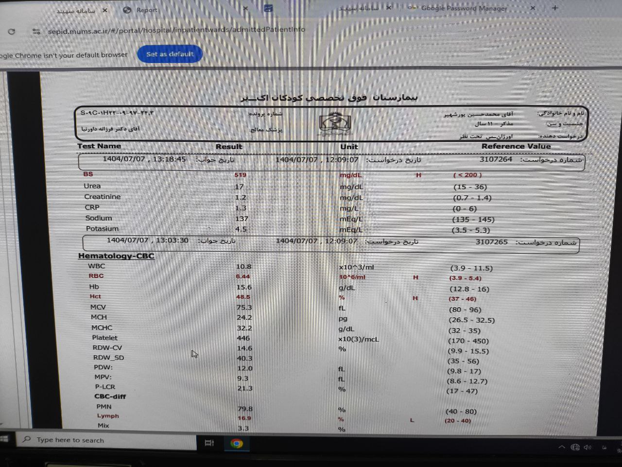 بیمار پسر ۱۱ ساله، با سابقه شناختهشده دیابت ملیتوس نوع ۱ از ۸ سال پیش، امروز از صبح دچار علائم کوریزا شده و از همان زمان احساس ناخوشی عمومی داشته است