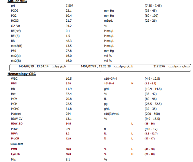 برای بیمار مسکن تجویز شد و آزمایشات و تصویر برداری های زیر درخواست شد :