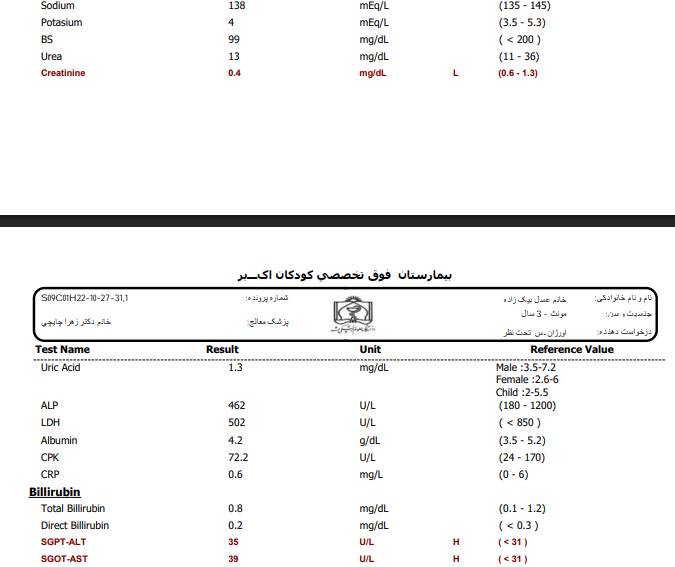بیمار دختر 3 ساله فرزند ۴/۴ سزارین ترم با وزن سه کیلو Z-Score: -0.8