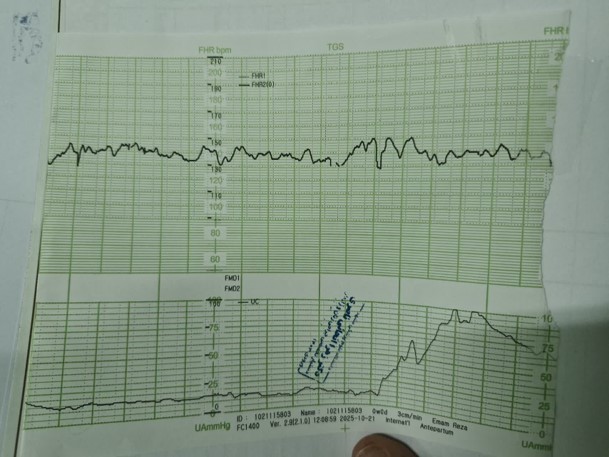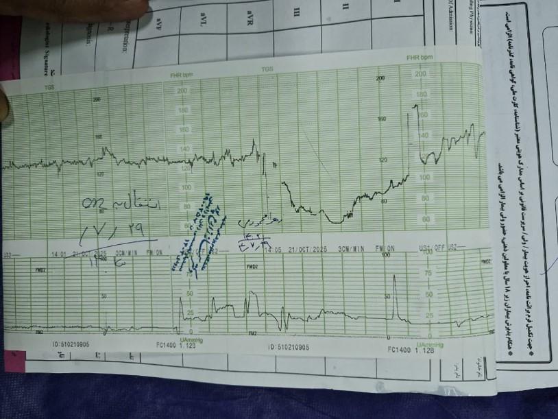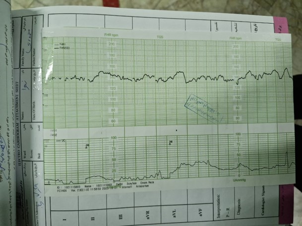 با سن حاملگی 37 هفته و 3 روز شکایت از درد زایمان و احساس کاهش حرکات جنین از شب قبل مراجعه کرده است.