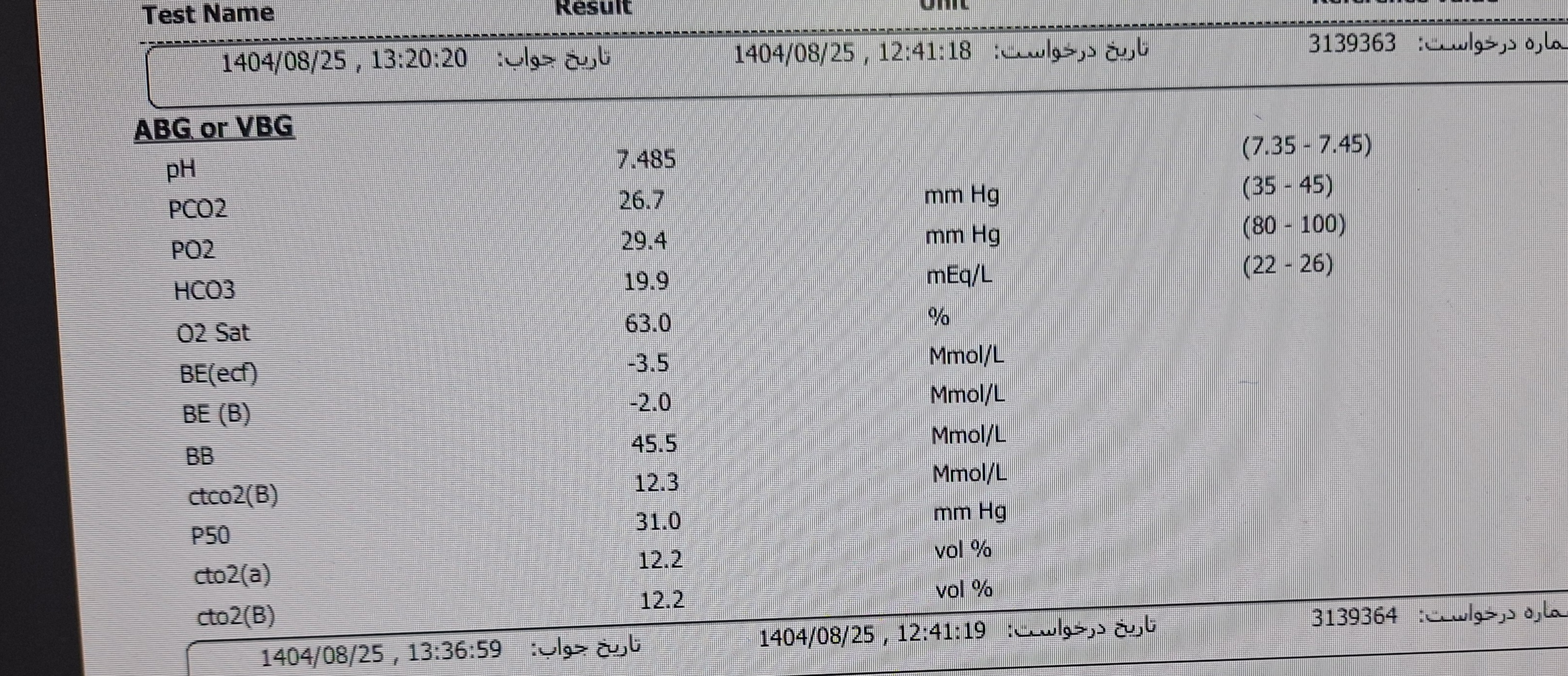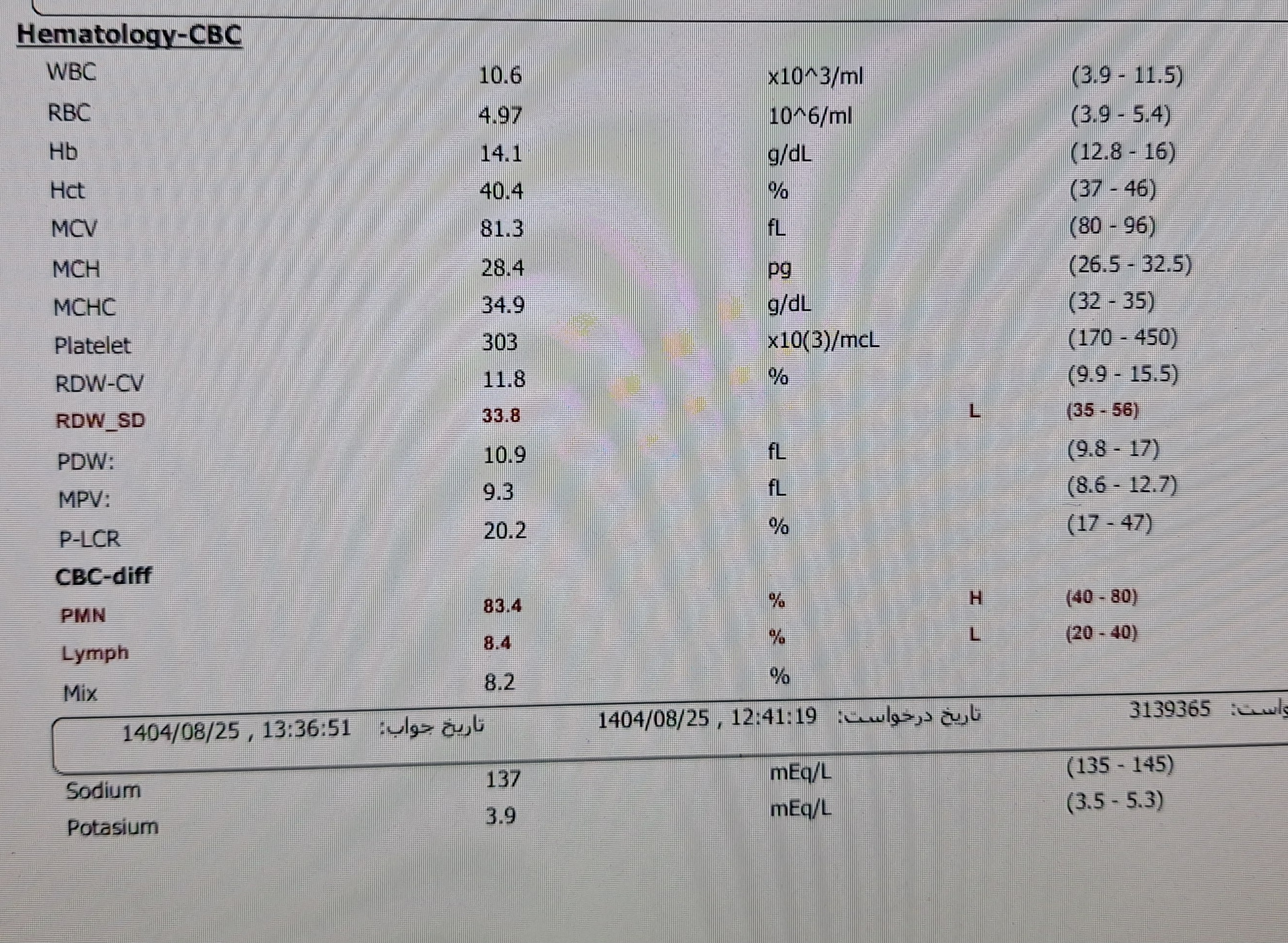 CS/ فرزند ۴/۵ / ایکتر نوزادی- / بستری NICU- / واکسیناسیون کامل / عمل آپاندیسیت یکسال پیش Weight: 27 kg (Z-Score: -1.04) BW:2200 g (Z-Score: -2.7 ) height: 138cm ( z-score: -0.1 ) تکامل نرمال