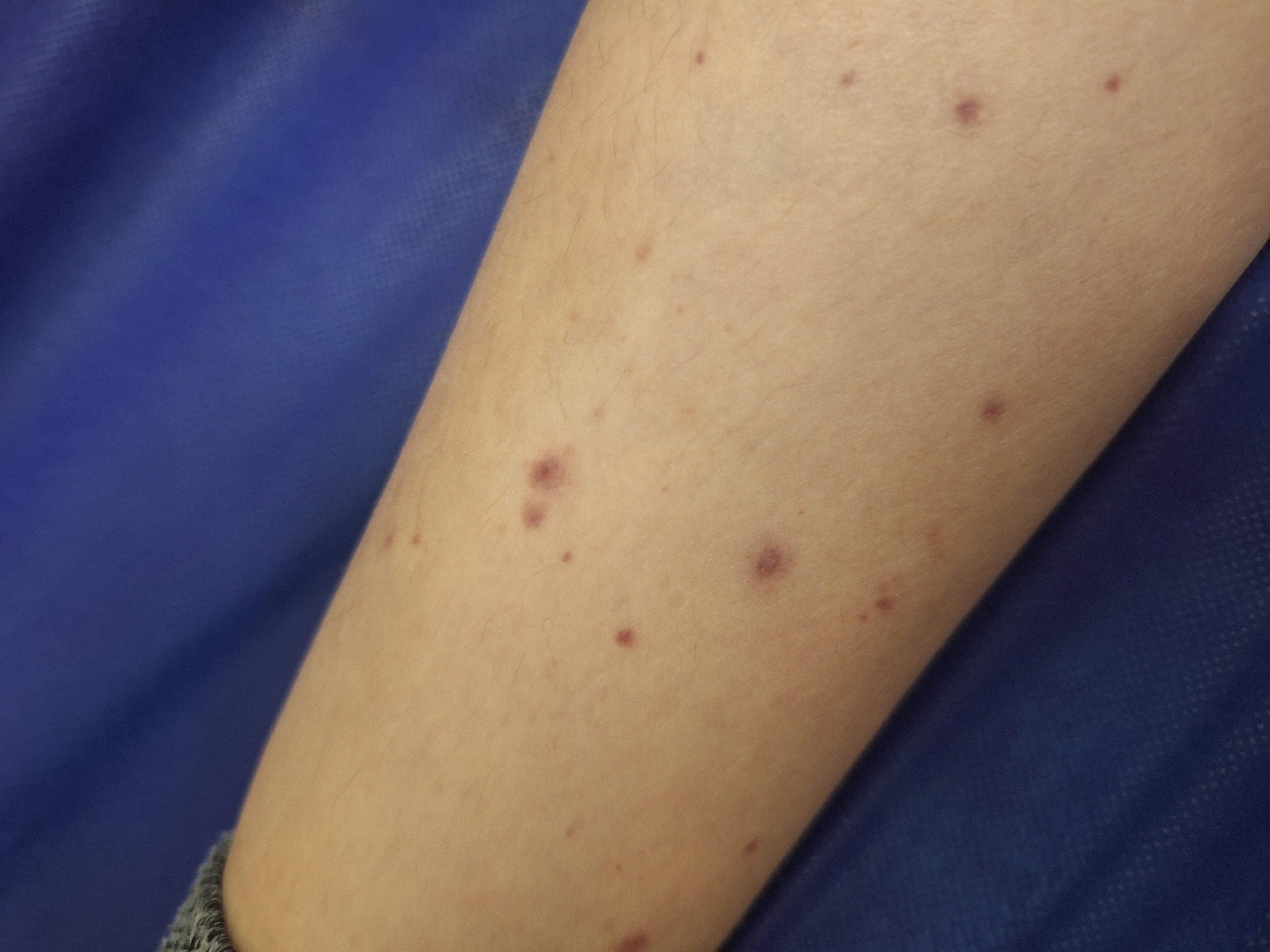 پورپوراهای قابل لمس قرمز بنفش رنگ تا حداکثر سایز 5mm در روی پا و ساق پا و قسمت خلفی رانها