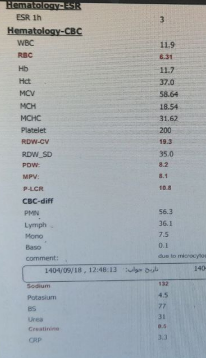 در معاینه چشم ها در معاینه چشم ها کنژیکتیویت ندارد ➖. خشکی چشم ➖ ملتحمه بیمار pale نیست➖ . اسکلرا ایکتریک ➖معاینه ریه و قفسه سینه :