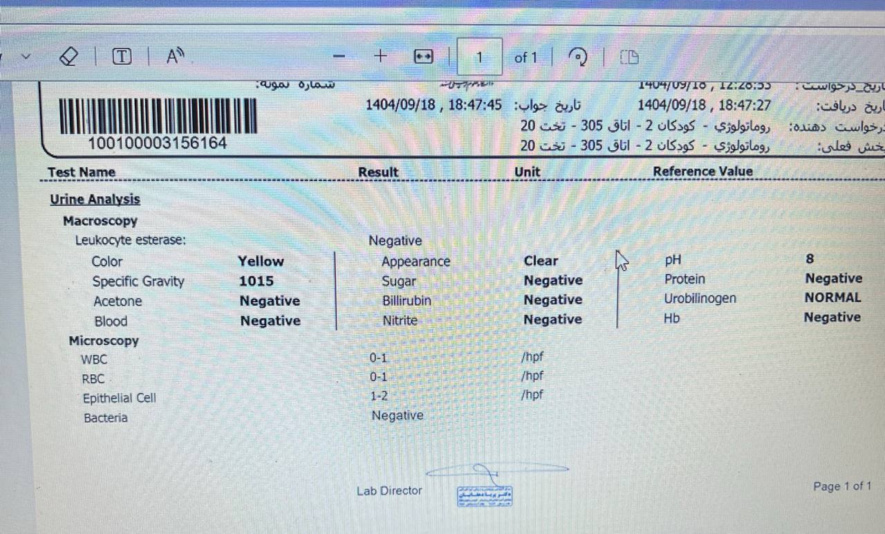در معاینه مفاصل زانو، انگشتان پا، دست ها و آرنج ، تندرنس، کاهش Range of motion یا افیوژن ندارد.در معاینه extremities: