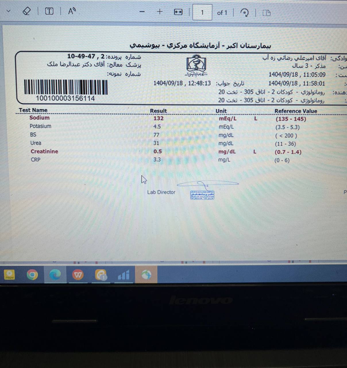 در عضلانی ➖ درد یا تورم مفاصل ➖ لنگ زدن ➖ ذکر نمیکند. البته مادر بیمار کمی مشکل در وزن گذاری پیش از شروع علائم(8 روز قبل) را ذکر میکند که محدود بوده.نورولوژیک: