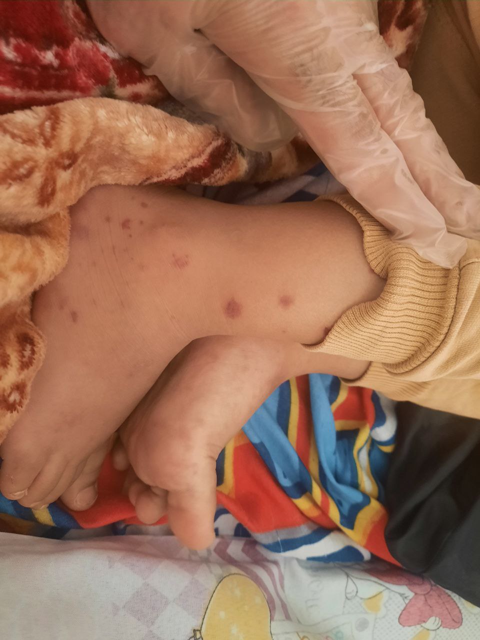 در نگاه ضایعات پتشی پورپورا و اکیموتیک در دیستال پاها(در قسمت خارجی پا ها) مشاهده میشود. شواهدی از ضایعات بهبود یافته قبلی دیده میشود.بیمار کودکی ۳ ساله با سابقه تشخیص هنوخ شوئنلاین (IgA Vasculitis) در بستری قبلی است که اکنون با عود ضایعات پتشی و پورپورای برجسته در اندامهای تحتانی، ناحیه اینگوئینال و ژنیتالیا مراجعه کرده است. ضایعات در این نوبت شدت بیشتری داشته و تا حدودی حالت اولسراتیو پیدا کردهاند. بیمار همچنین دچار درد شکمی کولیکی همراه با تهوع و استفراغ و عدم تحمل خوراکی شده است که اکنون تا حدود زیادی برطرف شده و در معاینه شکم تندرنس یا گاردینگ وجود ندارد. از سوی دیگر، بیمار دچار درگیری اسکروتوم و ضایعات پورپورا و اکیموز روی پنیس و کشالهران است.
