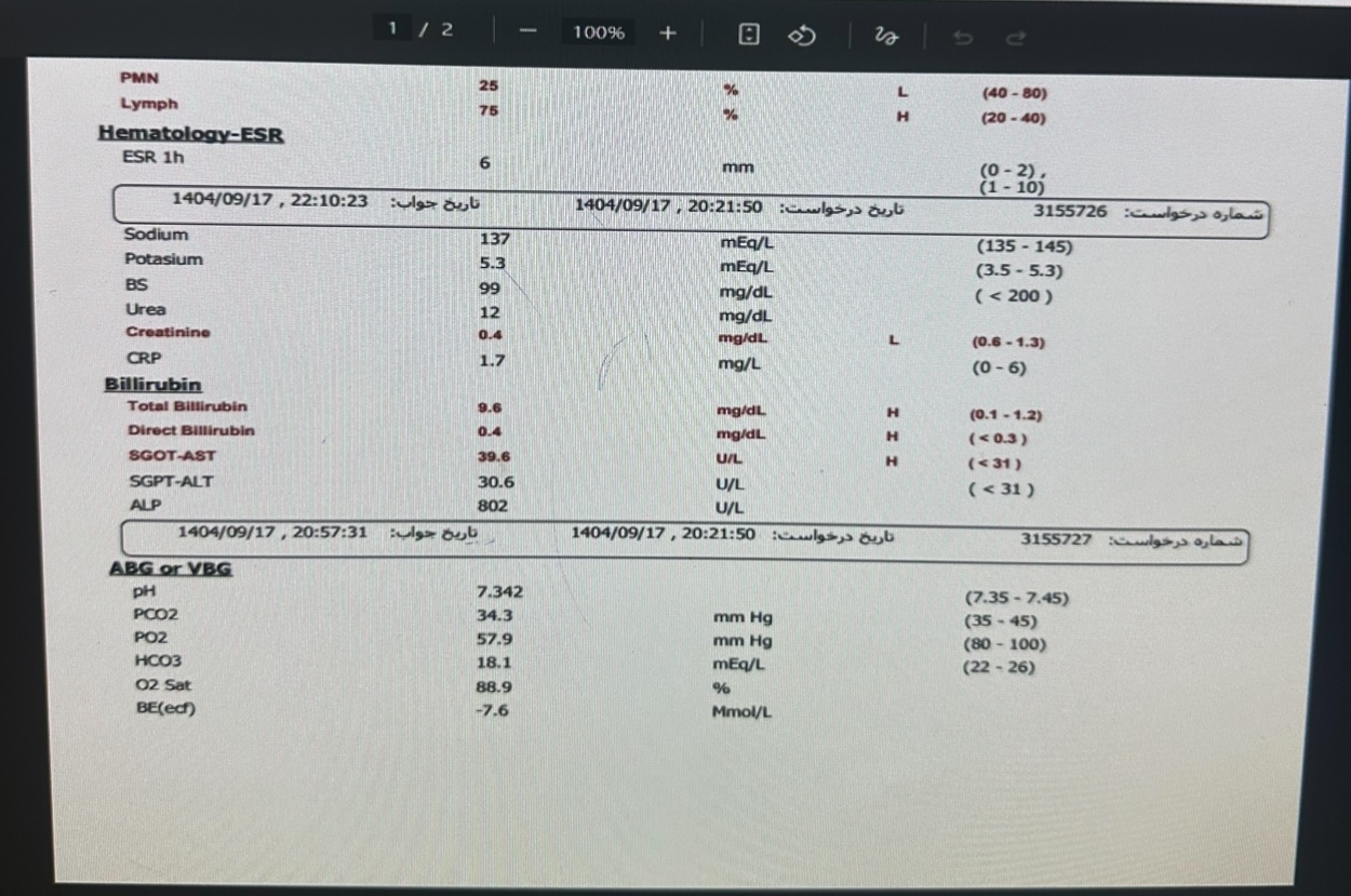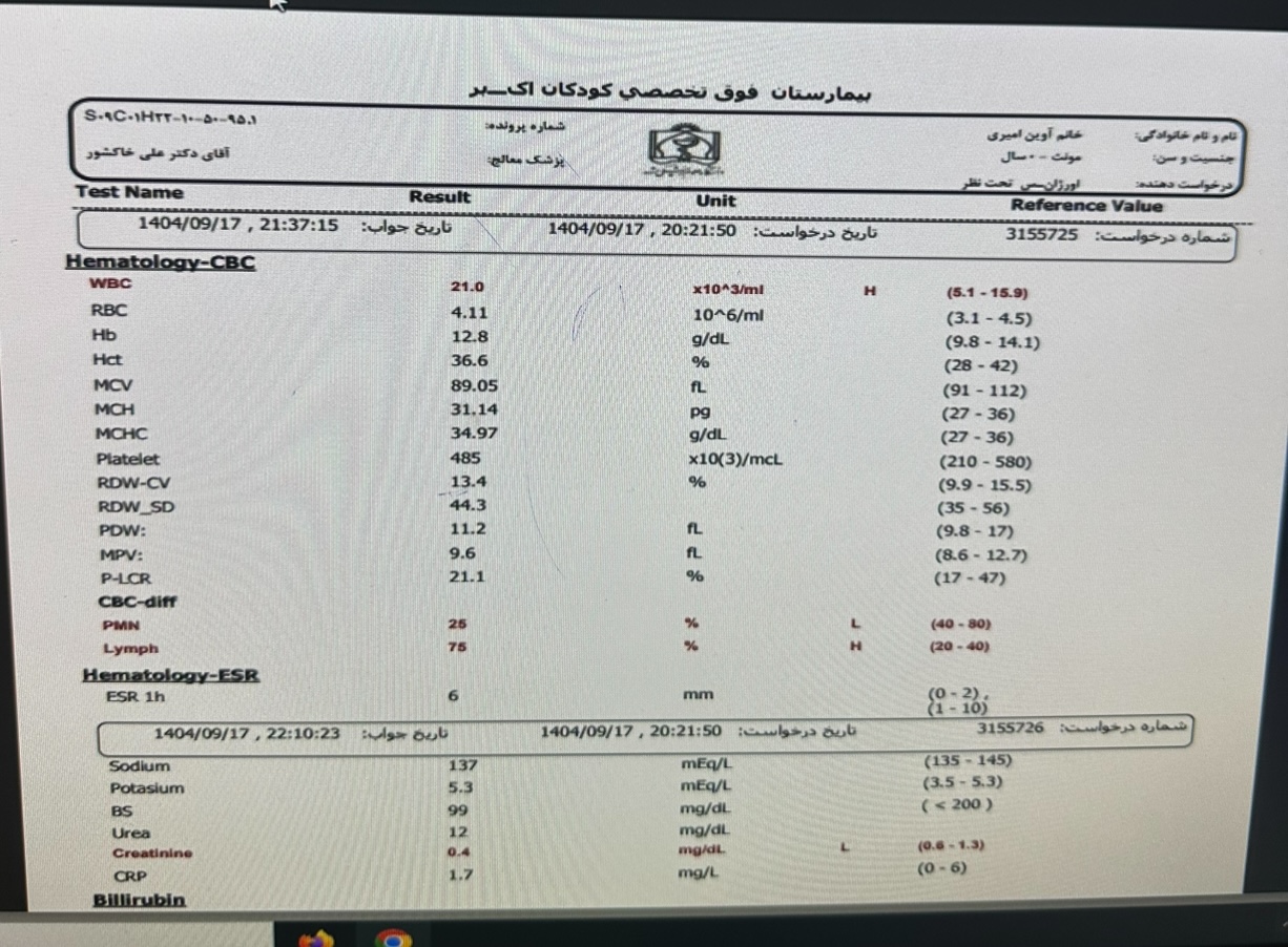 فشار سیستولی: 75بیمار دختر شیرخوار ۳۴روزه که ۱۰روزه سرفه و ایکتر داره