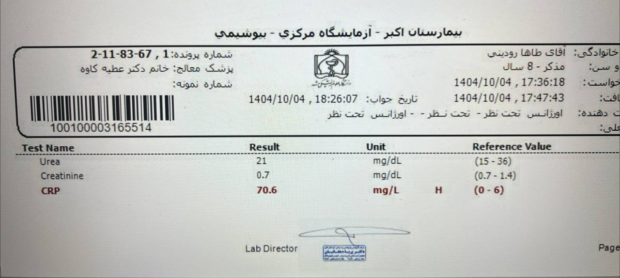 FH: بیماری خاصی در فرزندان دیگر ذکر نمیشود. پدر و مادر منسوب نیستند. پدر و مادر بیماری مزمنی را ذکر نمیکنند.