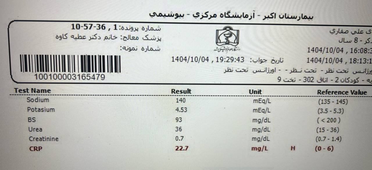 وي همچنين در آبان امسال با علائم مشابه (سرفه و تنگي نفس، درد گوش چپ) به بيمارستان طالقاني گلستان مراجعه كرده و با سرم تراپي / آنتيبيوتيک تحت درمان قرار گرفته.